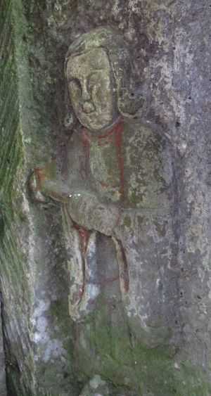 右側の小さな像が大変ユニークです。どう見ても近所の悪ガキにしか見えません。この顔で神様は無理だろうと思いますが、どうでしょうか。(本体のサイズ 左 91×45センチ 右奥 88×30センチ)