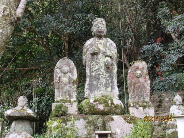 この十一面観音は凝灰岩で総高265センチ。立像の三尊石仏で、両脇侍(天部像)の向かって右に不動明王、左に多聞天を従えた実に壮大なものである。