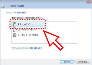 「追加するアカウントの種類」の中から、「電子メールアカウント」が選択されていることを確認します。 もし、他の項目が選択されていましたら、「電子メールアカウント」をクリックしてください。
